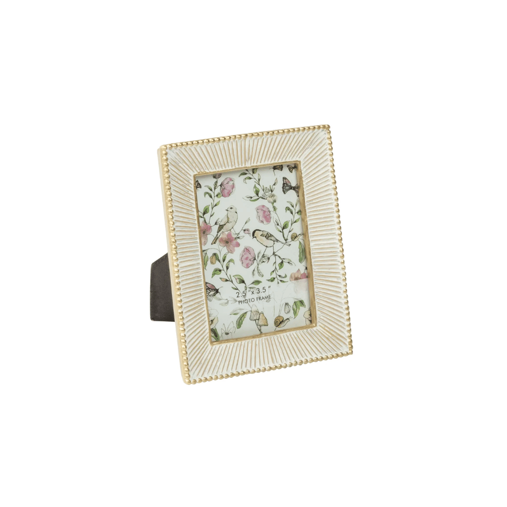 Showcase a favorite memory in timeless style with the Embossed Fan Mini Picture Frame. Designed to hold a 2.5" x 3.5" photo, this petite frame features a beautifully textured fan-pattern border accented with a soft antiqued gold finish and delicate beaded edging. Its refined yet versatile look complements both modern and traditional décor, making it perfect for bedside tables, bookshelves, desks, or gifting to someone special. Charming, elegant, and just the right size to highlight a treasured moment.
